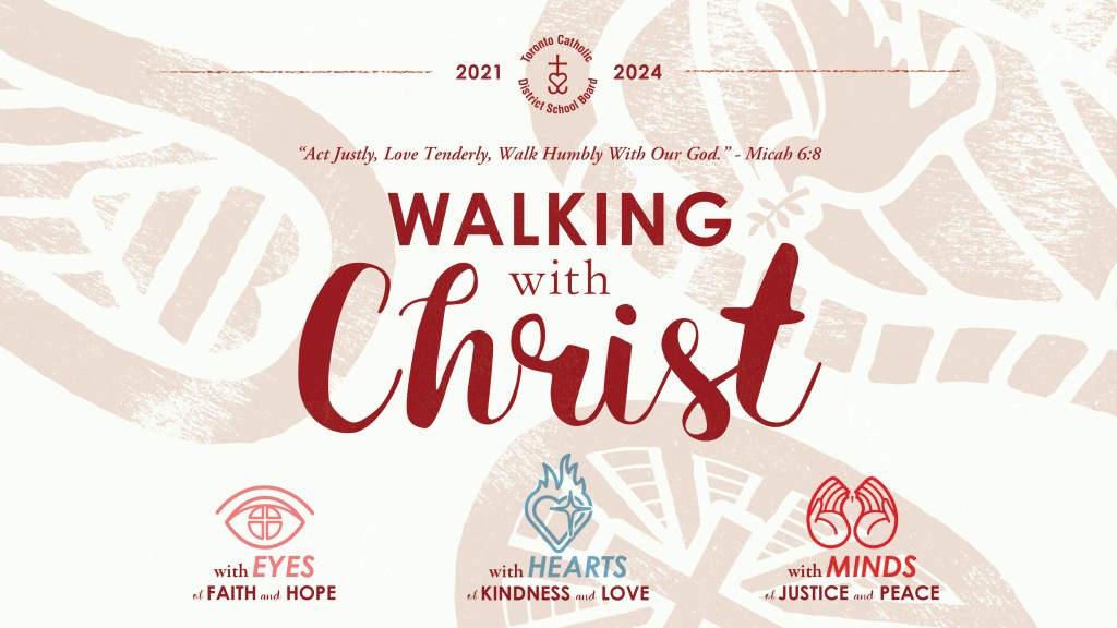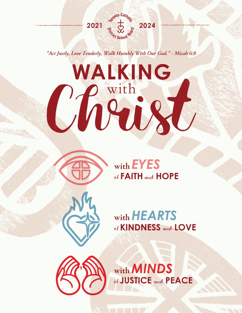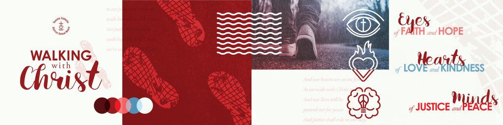 In my time at the TCDSB, I had the opportunity to create the branding and launch graphics for multiple pastoral plans. What is a “pastoral plan”? Basically, every three years a dedicated group of teachers and administrators, representing the Board’s educational and religious interests, choose a theme in which school/board activities, events and curriculum can be centred around. This theme is segmented into three separate components, one for each individual year, that then tie back into the overarching theme. After the previous campaign wound down, the new theme chosen was “Walking with Christ“, with the individual years being broken down to: with eyes of faith and hope (2021/22), with hearts of kindness and love (2022/23), with minds of justice and peace (2023/24).