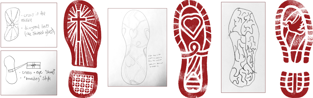 I decided it would be beneficial to evolve the types of shoes the prints would represent with each passing year. Make the designs move from more of a loafer in the first year (easing yourself around) to an all out runner by the third year (ready to run again). In a nod to the previous pastoral plan, I also decided to add in the three elements of the Board logo (the cross, the heart, the anchor). Having one of these on each subsequent design helped further the idea of progression and moving forward, while ultimately tying it all back to the TCDSB’s own mission.