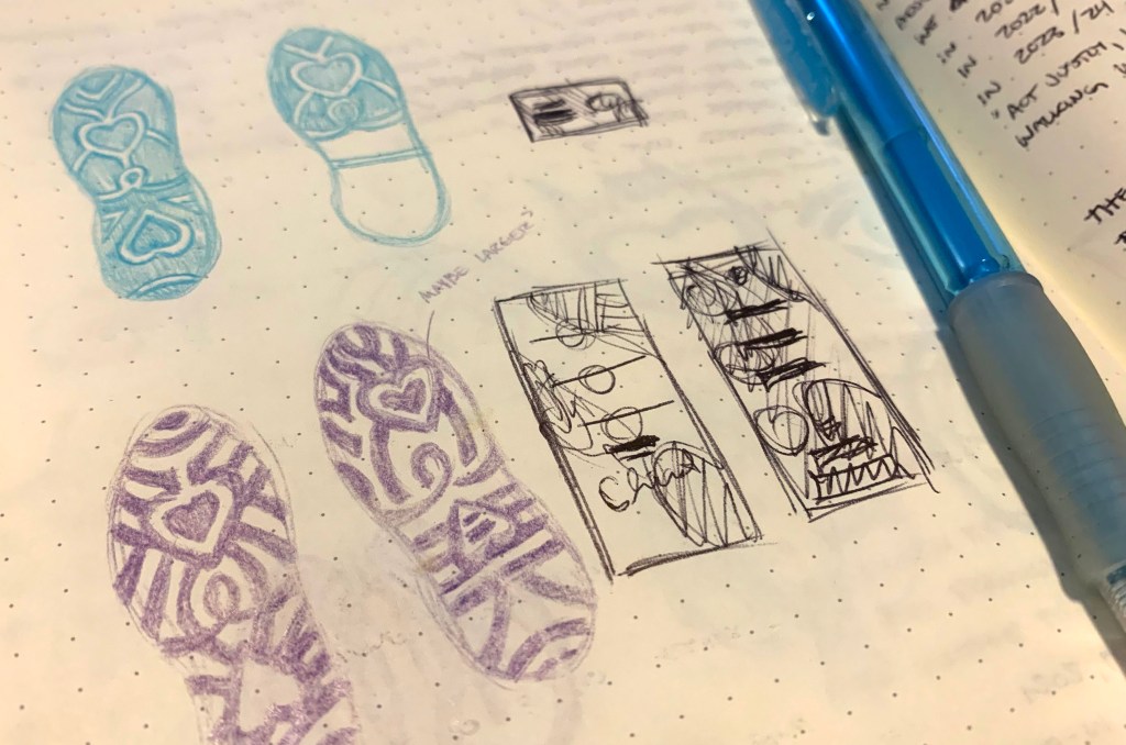 The decision was made to also make the shoe prints unique and representative of each individual year. This helped to be able to break the designs up and use a single shoeprint each year of the plan or use all three together as needed. The students were also tasked with providing sketches and I did my best to make sure their ideas were included in the final designs. Each shoe once again depicts the three elements of each individual year with the patterns and tread complimenting those ideas.